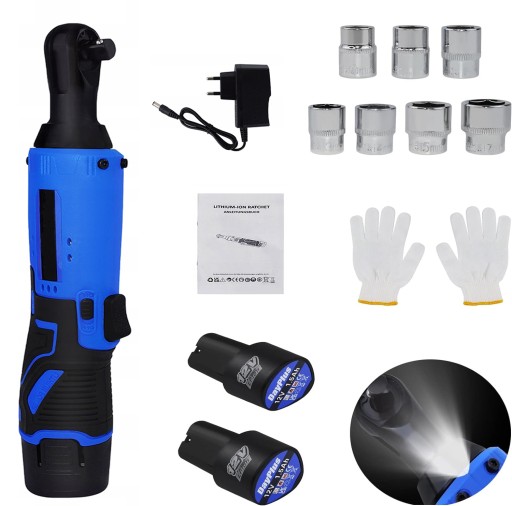 Bezprzewodowy klucz grzechotkowy, 2 akumulatory 1500 mAh, 1 ładowarka EU, 7 nasadek - 10 mm, 11 mm, 12 mm, 13 mm, 14 mm, 15 mm, 17 mm.