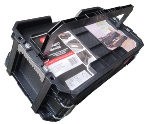 - Plastikowy regał na narzędzia Connect składa się z dwóch pojemnych, wysuwanych szuflad