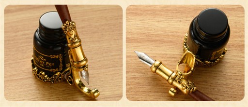 - W komplecie: 3x pióro, 1x stempel do wosku, 1x słoik z woskami różne kolory, 6x tusz do pisania, 1x świeca do podgrzewania wosku, 1x pojemnik szklany do tuszu/wosku, 1x nalewak do podgrzewania wosku, 1x otwieracz do listów, 1x podstawka pod pióro i tusz, 1x podstawka pod stempel, 1x pudełko prezentowe
