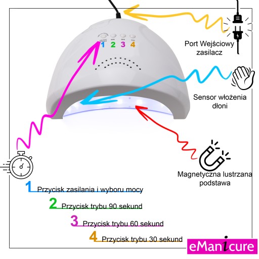 - Posiada tryb zmniejszonego ogrzewania, który redukuje efekt pieczenia płytki paznokcia podczas utwardzania żelem