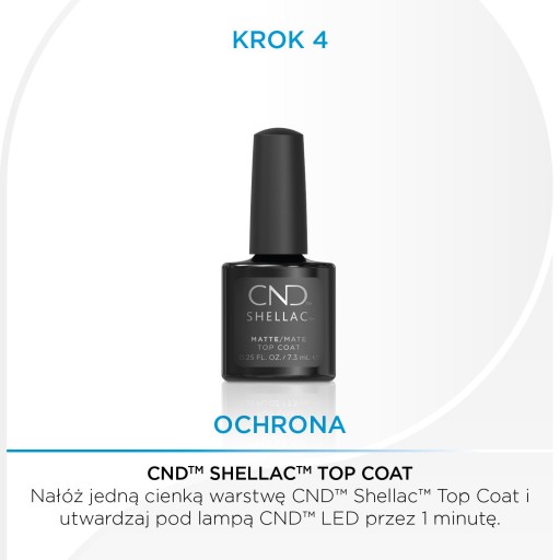- Zabezpieczamy stylizację aplikując CND Shellac Top Coat i utwardzamy w lampie