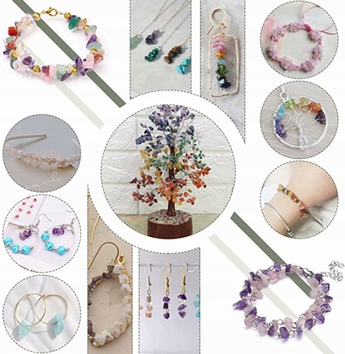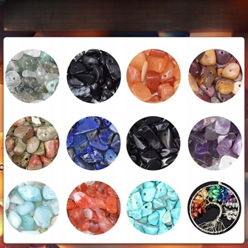 Materiał: naturalne luźne koraliki z kamienia wiórowego, w tym lapis lazuli, tygrysie oko, czerwony agat, zielony awenturyn, kwarc różowy, ametyst, kryształ górski, howlit, niebieski turkus, cytryn, fluoryt, prehnit, obsydian, amazonit, kwarc wiśniowy.
