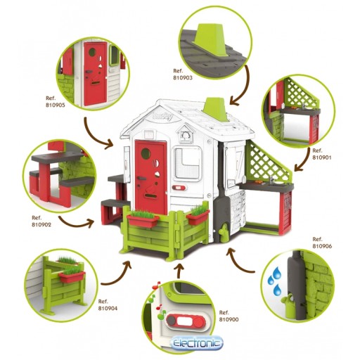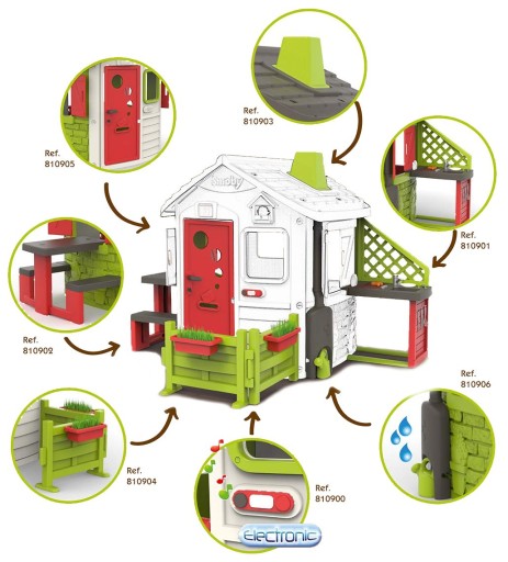 Możliwość dokupienia dodatkowych elementów do domu takich jak: dzwonek do drzwi, komin, drzwi, rynnę ze zbiornikiem na deszczówkę, zielony płotek z doniczkami, letnią kuchnię czy stolik z ławeczkami.