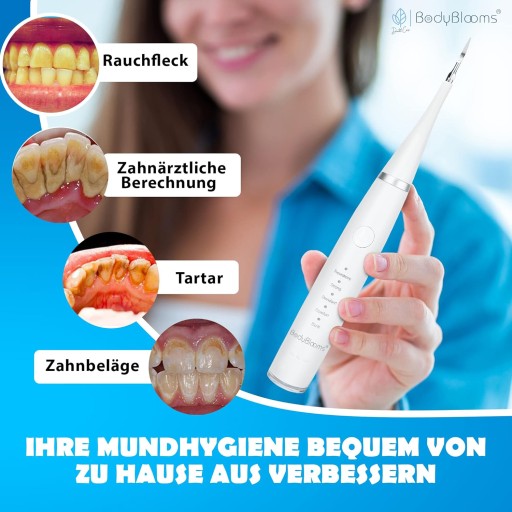 Opis Produktu: BODYBLOOMS® Zestaw do Usuwania Kamienia Nazębnego zapewnia kompleksową pielęgnację zębów w zaciszu własnego domu. Dzięki specjalnej technologii z 31000 wibracjami na minutę, skutecznie usuwa kamień nazębny i plamy, pozostawiając zęby czyste, błyszczące i zdrowe. Jest to idealne rozwiązanie dla osób z problemami z dziąsłami, oddechem czy przebarwieniami spowodowanymi paleniem papierosów lub spożywaniem kawy.