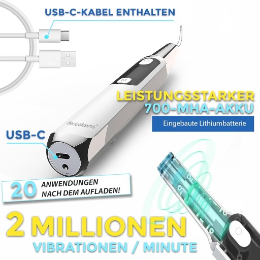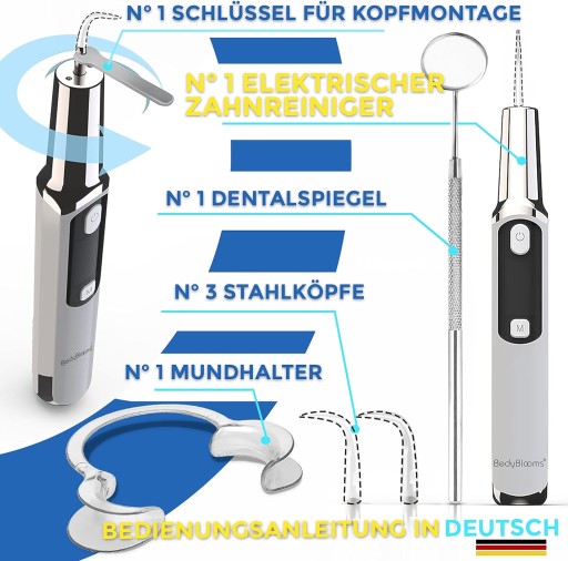 Akcesoria w zestawie otrzymują Państwo elektryczny środek do czyszczenia przestrzeni międzyzębowych, nr 1 do czyszczenia zębów, lusterko zębowe N.1, wymienne głowice szczoteczki N.3, aby skutecznie oczyścić usta. Otrzymasz również instrukcję obsługi w języku niemieckim. Nadaje się również do usuwania kamienia nazębnego dla psów.
