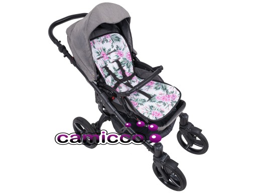 Idealnie pasuje do większości wózków spacerowych dostępnych na rynku. Wkładka wykonana jest wodoodpornego materiału który zapewnia odpowiednią cyrkulację powietrza pomiędzy ciałem Dziecka a wózkiem w którym siedzi, pod nią wszyta jest mięciutka pianka, pod spodem obszyta podszewką
