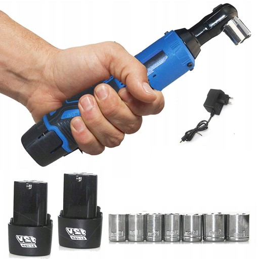 Bezprzewodowy klucz grzechotkowy, 2 akumulatory 1500 mAh, 1 ładowarka EU, 7 nasadek - 10 mm, 11 mm, 12 mm, 13 mm, 14 mm, 15 mm, 17 mm.