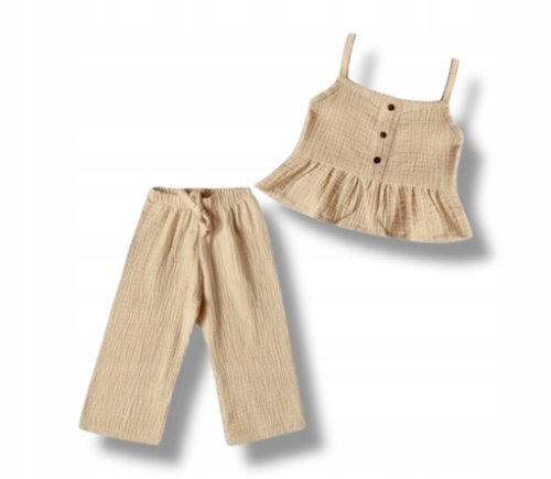Komplet muślinowy dla dziewczynki składa się z krótkiej bluzki oraz spodni dzwonów w beżowym kolorze. Bluzka posiada ramiączka oraz falbankę w dolnej części która dodaje uroku i dziewczęcego uroku. Spodnie dzwony mają lekko rozszerzające się nogawki, które dodają lekkości i swobody ruchom. Cały zestaw wykonany jest z delikatnego i przewiewnego materiału muślinowego, który zapewnia komfort noszenia nawet w ciepłe dni. Idealny wybór dla małych dam, które lubią klasyczny i dziewczęcy styl.