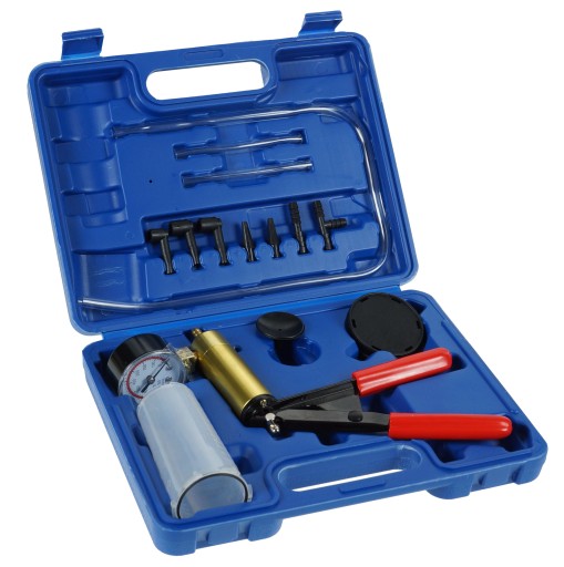 Zestaw do odpowietrzania i kontroli podciśnienia. Zestaw zawiera dokładny manometr do testowania i serwisowania wielu różnych systemów ciśnieniowych w samochodach. Pozwala na odpowietrzanie hamulców oraz testowanie systemów próżniowych w samochodach.