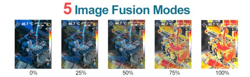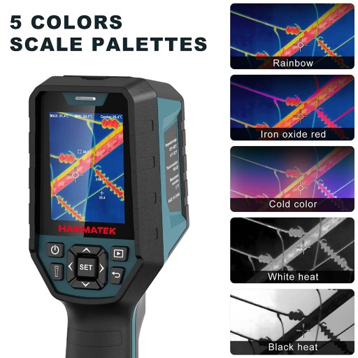 PIĘĆ PALET KOLORÓW I REGULOWANY POZIOM EMISJI 5 palet kolorów i regulowana emisyjność: 5 różnych palet kolorów (żelazna czerwień, tęcza, żarowe, czarna poświata, czerwona gorąca) można wybrać bezpośrednio w kamerze termowizyjnej, które są bardzo odpowiednie dla wysokich kontrast termiczny i identyfikuj różnice temperatur! Regulowana emisyjność od 0,01 do 0,99 z 4 rodzajami trybów pomiaru obiektów.