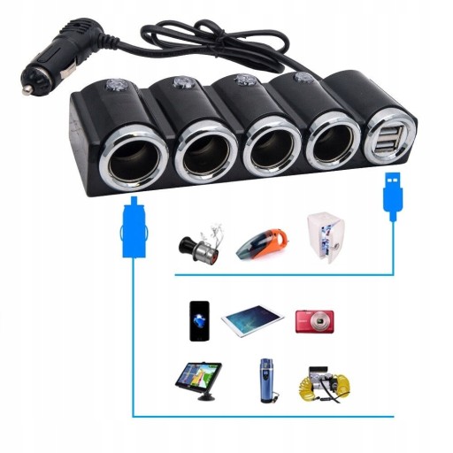 Rozdzielacz umożliwia podłączenie czterech urządzeń jednocześnie, poprzez wtyk gniazda zapalniczki oraz gniazdo USB np.: ładowarkę, CB radio, odkurzacz, nawigację GPS, lodówkę turystyczną, itp