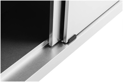 Duża szafka pomieści wiele sprzętów. Umieszczono w niej pojemną półkę zapewniającą dodatkową przestrzeń do przechowywania. Szafka jest zamykana przesuwnymi drzwiami, które zajmują niewiele miejsca, są bezpieczne w użyciu i zapewniają łatwy dostęp do wnętrza.