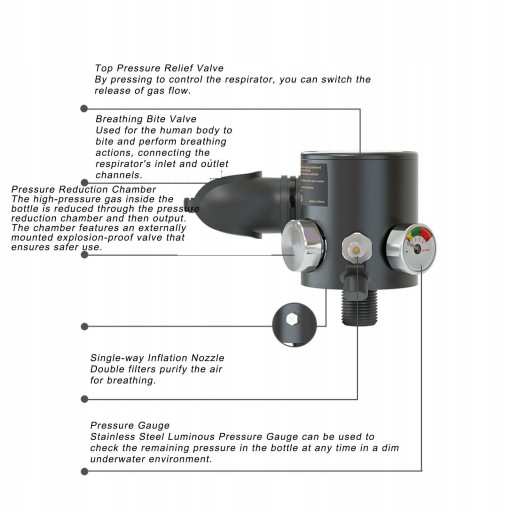 Cecha: 1. Głowica zaworu oddechowego: zapewnia stabilne oddychanie przy stałym zwiększeniu ciśnienia, zewnętrzny zawór przeciwwybuchowy zapewniający bezpieczeństwo, płynne oddychanie dla przyjemniejszego nurkowania z rurką.