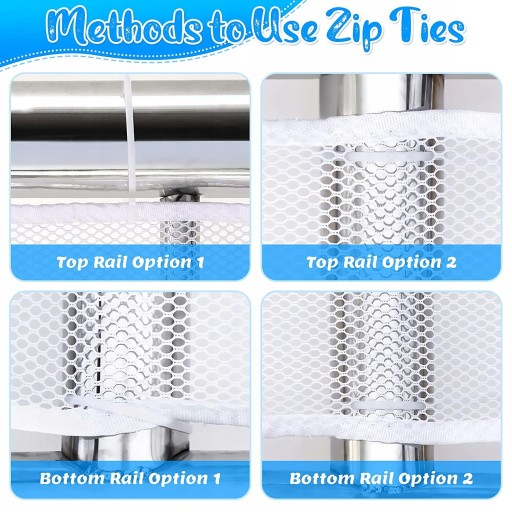 3. [Łatwa instalacja] użyj plastikowej, wisząca klamra, aby przejść przez siatkę, a następnie zablokuj ją za pomocą poręczy lub użyj liny do pisania, aby przymocować siatkę i poręcz, aby zamocować siatkę. Jeśli poręcz jest dłuższa, możesz użyć tej samej metody instalacji, aby połączyć dwie lub więcej sieci. Jeśli poręcz jest stosunkowo krótka, możesz złożyć siatkę i zainstalować ją