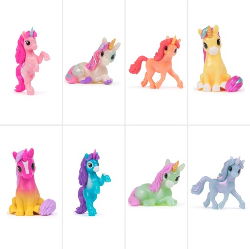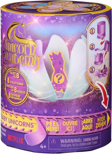 W każdym opakowaniu mały jednorożec w zabawnej pozie czeka na odkrycie w magicznie połyskującym kwiecie. Do zebrania jest łącznie 8 różnych postaci, które ożywiają historie popularnego serialu Unicorn Academy.
