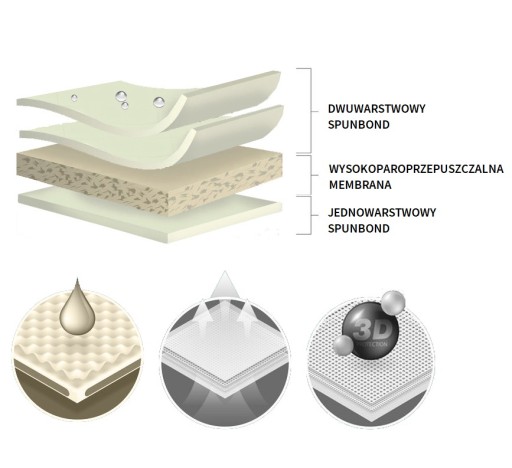 - nieprzemakalny nawet podczas intensywnego deszczu i jednocześnie paroprzepuszczalny;