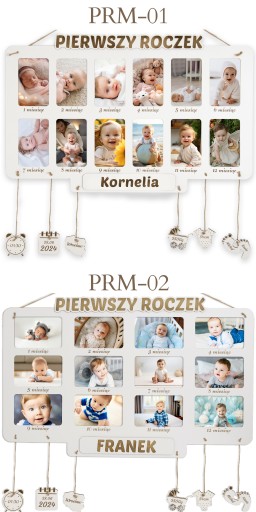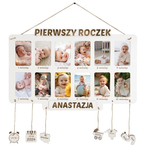 Wykonana z białej płyty. Posiada grawerowane podpisy na każdy miesiąc, na górze napis "PIERWSZY ROCZEK" oraz imię dziecka na dole ramki. Posiada również elementy metryczki - dane urodzenia dziecka, które są zawieszone na sznureczkach jutowych pod ramką. Idealna ozdoba która pięknie będzie prezentować się zarówno w pokoiku dziecięcym, jak i w salonie.