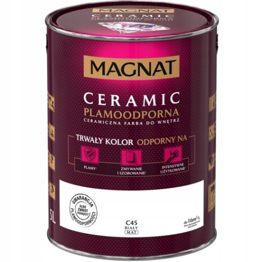 MAGNAT Ceramic to ceramiczna farba do wnętrz, 3. generacji bazująca na ceramicznych komponentach oraz najwyższej jakości żywicach i pigmentach. Ta unikalna formuła zapewnia farbie MAGNAT ponadprzeciętne parametry odporności na szorowanie i wielokrotne zmywanie oraz sprawia, że powłoki farby nie absorbują zabrudzeń i „trudnych” plam oraz są odporne na dezynfektanty. Zapewnia to uzyskanie wyjątkowej trwałości powłoki i kolorów.