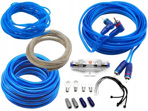 Zestaw przewodów do zamontowania wzmacniacza w samochodzie. Zestaw umożliwia szybką i profesjonalną instalację wzmacniacza.