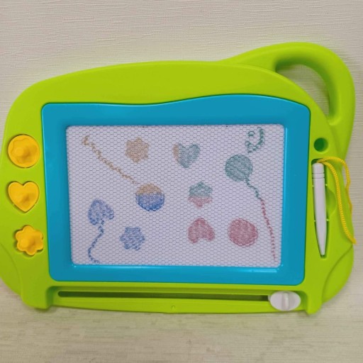 Znikopis mini, plansza wielokolor, pieczątki / kwiatek, serduszko, kółko/ , rysik.