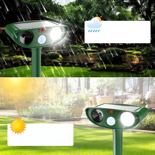 Wodoodporny środek odstraszający zwierzęta pozwala na działanie w każdych warunkach pogodowych. W górnej części środka odstraszającego zwierzęta znajdują się panele słoneczne, które mogą przekształcać światło słoneczne w energię elektryczną, co przynosi korzyści w zakresie oszczędzania energii i ochrony środowiska. Jest to lepsze narzędzie pomóc Ci uzyskać ciche otoczenie.