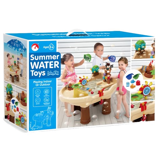 Stolik wodny może być używany zarówno wewnątrz, gdyż zestaw zawiera piękny parasol, który zapewnia cień i ochrania przed słońcem. Dzieci mogą bawić się nim na tarasie, balkonie, w ogrodzie czy na plaży.
