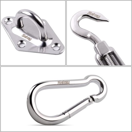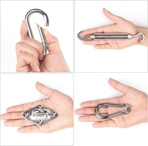 - Z karabińczykami, nakrętkami napinającymi i uchwytami ten zestaw narzędzi umożliwia łatwą i bezpieczną instalację żagla przeciwsłonecznego.
