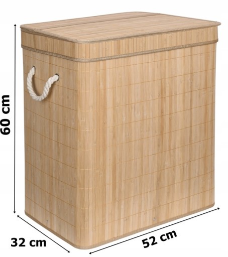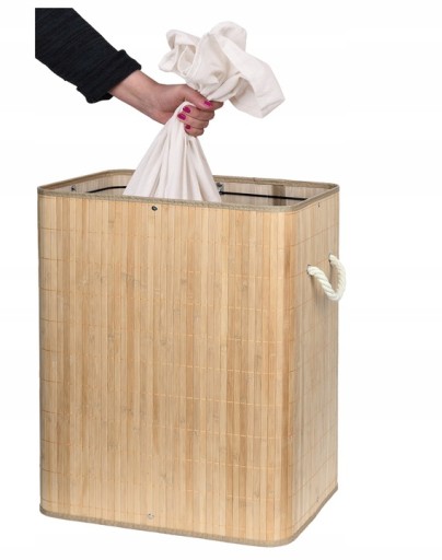 Wykonany z naturalnego bambusa kosz do gromadzenia brudnej odzieży i bielizny przed praniem. Bardzo praktycznym rozwiązaniem jest zastosowany tutaj podział zawartości pojemnika na dwie części, z przeznaczeniem na odzież jasną i ciemną. Prosty i naturalny wygląd sprawia, że pojemnik wkomponuje się w każde pomieszczenie. Zaletą kosza bambusowego jest niewątpliwie elegancki wygląd, przeważający szalę nad zwykłymi pojemnikami z tworzywa. Kosz wyposażony został w wewnętrzny wyjmowany wkład z tkaniny. Konstrukcja pojemnika jest stabilna i sztywna.