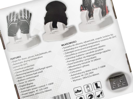 - Delikatnie usuwa wilgoć z wewnątrz obuwia dzięki automatycznie dobranej temperaturze suszenia