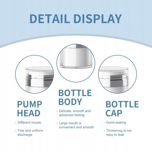 Pompa bezpowietrzna: pompa próżniowa może skutecznie izolować powietrze, zapobiegać niszczeniu tlenu przez krem nawilżający i kremy, długotrwałą ochronę, czystość i higienę.