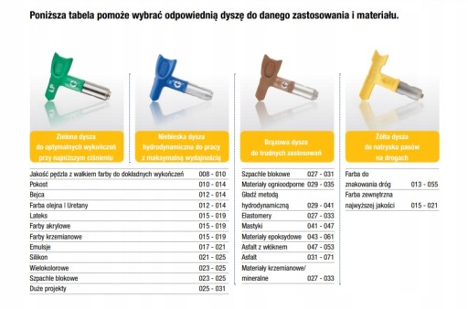 Rozmiary dysz rekomendowanych do aplikacji odpowiednich materiałów: