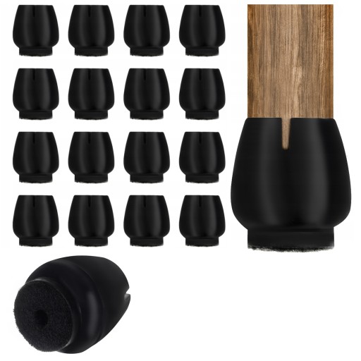 - SPECYFIKACJA - ilość: 16 sztuk; kolor: czarny; na nogi krzesła o średnicy: 12-16 mm; materiał: silikon + filc; wymiary: 23mm – 25mm; waga jednej sztuki 3g; waga zestawu: 67 g; waga w opakowaniu: 68g; materiał: PVC, filc