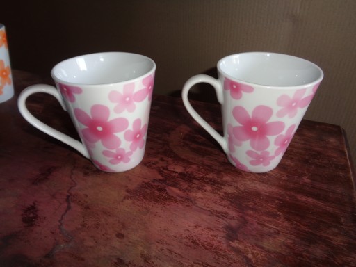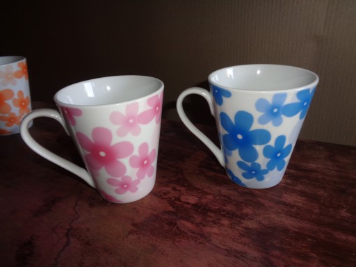 Klasyczne kubki ceramiczne, szkliwione z motywem kwiatowym.