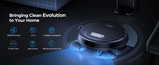 6000Pa Suction / 3-in-1 Cleaning / Intelligent Navigation / 7.6cm Ultra-thin / App Control / 180min Runtime