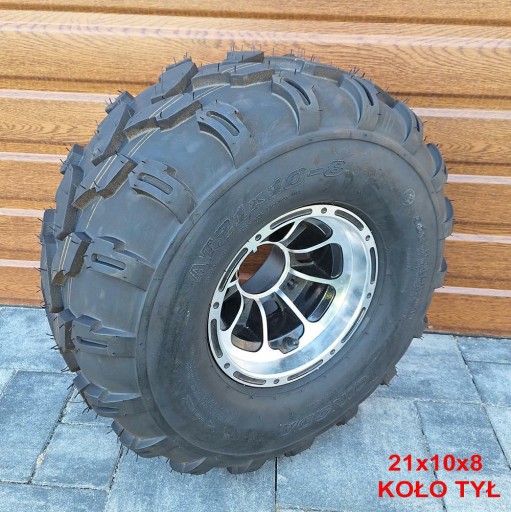 Aukcja dotyczy kompletnego koła opona alufelga dekiel piasty oraz komplet śrub jak na foto. Orginalna opona z alufelgą kostka z Fabryki Fuxin do quada DIABLO ATV 150/200 TYŁ Rozm.21x10x8.