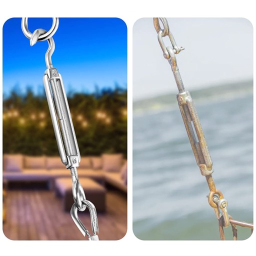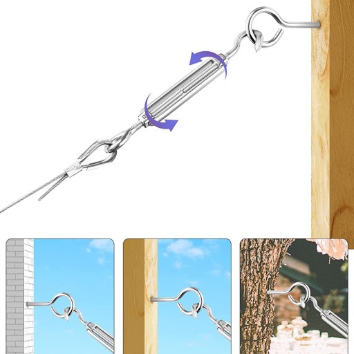 Zestaw napinacza linki stalowej 3 mm wykonany ze stali nierdzewnej 304, aluminiowa tuleja zaciskowa wykonana z aluminium, nowa tuleja kablowa z podwójnym otworem wykonana ze stali węglowej, zapewnia dobrą odporność na korozję i rdzę, twarda i wytrzymała, pozwala na użycie w każdych warunkach pogodowych, bardzo łatwa w montażu i demontażu.