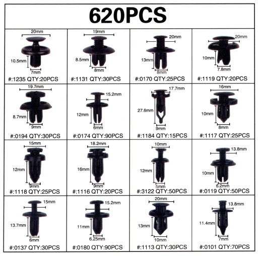 Zestaw 625 ELEMENTÓW, w skład którego wchodzi 18 najpopularniejszych rozmiarów klipsów i łączników mocujących. Zestaw został wzbogacony o narzędzie do usuwania klipsów.