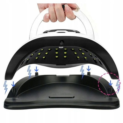 - Diody rozmieszczone są równomiernie na całej górnej podstawie i po bokach, dzięki czemu dobrze doświetlają całą dłoń prawidłowo utwardzając żel na każdym paznokciu
