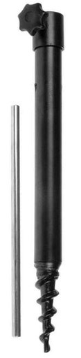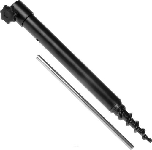 Wzmocniona baza z gwintem do osadzenia parasola wędkarskiego. Pręt na łańcuszku umożliwiający wkręcenie w twarde podłoże.