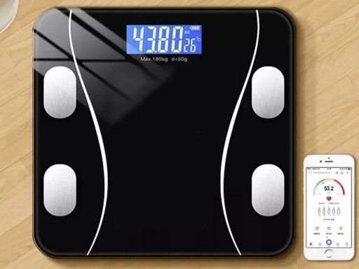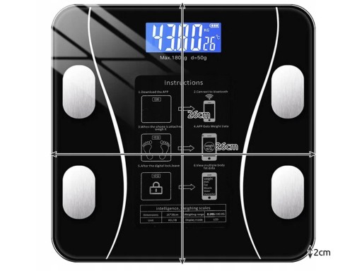 WAGA ŁAZIENKOWA ANALITYCZNA LCD ELEKTRONICZNA BMI BLUETOOTH SMART SZKLANA