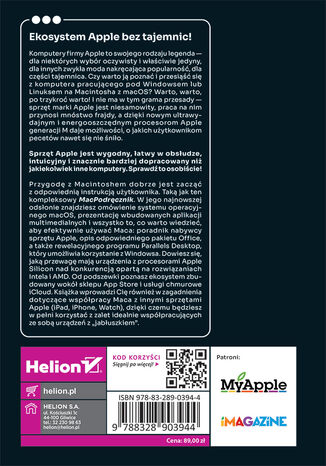 MacPodręcznik. Odkryj moc możliwości macOS A gdyby tak przesiąść się na Maca? Komputery firmy Apple to swojego rodzaju legenda - dla niektórych wybór oczywisty i właściwie jedyny, dla innych zwykła moda nakręcająca popularność, dla części tajemnica. Czy warto ją poznać i przesiąść się z komputera pracującego pod Windowsem lub Linuksem na Macintosha z macOS? Warto, warto, po trzykroć warto! I nie ma w tym grama przesady - sprzęt marki Apple jest niesamowity, praca na nim przynosi mnóstwo frajdy, a dzięki nowym ultrawydajnym i energooszczędnym procesorom Apple generacji M daje możliwości, o jakich użytkownikom pecetów nawet się nie śniło. Sprzęt Apple jest wygodny, łatwy w obsłudze, intuicyjny i znacznie bardziej dopracowany niż jakiekolwiek inne komputery. Sprawdź to osobiście! Przygodę z Macintoshem dobrze jest zacząć z odpowiednią instrukcją użytkownika. Taką jak ten kompleksowy MacPodręcznik. W jego najnowszej odsłonie znajdziesz omówienie systemu operacyjnego macOS, prezentację wbudowanych aplikacji multimedialnych i wszystko to, co warto wiedzieć, aby efektywnie używać Maca: poradnik nabywcy sprzętu Apple, opis odpowiedniego pakietu Office, a także rewelacyjnego programu Parallels Desktop, który umożliwia korzystanie z Windowsa. Dowiesz się, jaką przewagę mają urządzenia z procesorami Apple Silicon nad konkurencją opartą na rozwiązaniach Intela i AMD. Od podszewki poznasz ekosystem zbudowany wokół sklepu App Store i usługi chmurowe iCloud. Książka wprowadzi Cię również w zagadnienia dotyczące współpracy Maca z innymi sprzętami Apple (iPad, iPhone, Watch), dzięki czemu będziesz w pełni korzystać z zalet idealnie współpracujących ze sobą urządzeń z "jabłuszkiem".