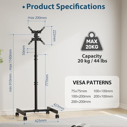 - Regulacja wysokości: aby uzyskać idealny kąt widzenia, stojak pod telewizor jest wyposażony w 5 poziomów wysokości od 910 mm do 1160 mm, przy czym każda wysokość różni się o 50 mm. Ponadto ten wózek pod telewizorem może być również pochylony o 30 stopni w górę i zapewnia różne kąty widzenia