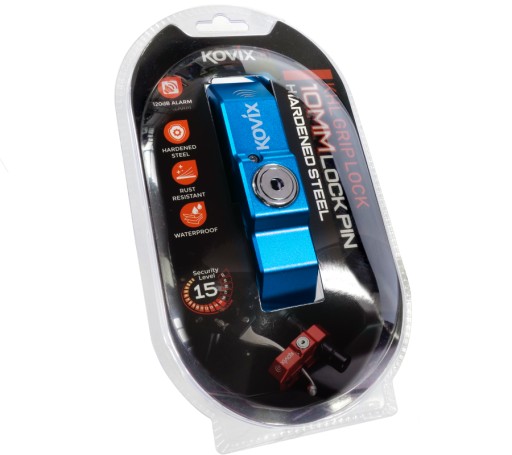 Blokada dźwigni hamulca marki KOVIX wyposażona w alarm o natężeniu dźwięku 120 dB i wykonana jest z wysokiej jakości stali, dzięki czemu jest odporna na korozję i uszkodzenia. Powleczona farbą z powłoką antykorozyjną. Wodoodporne podzespoły elektryczne gwarantują niezawodność w każdych warunkach atmosferycznych. Zabezpieczenie blokuje dźwignię bolcem o średnicy 10 mm, przez co uniemożliwia jazdę motocykla lub skutera.