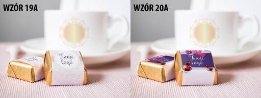 Czekolada mleczna z nadzieniem pistacjowym. Wymiary 1 szt. ok 35x35x15 mm. Ważność minimum 3 mies. od chwili realizacji zamówienia. W 1kpl. można umieścić 1 wzór etykiety/ napisów.