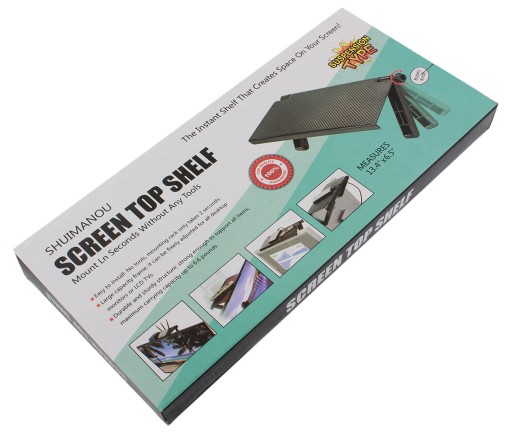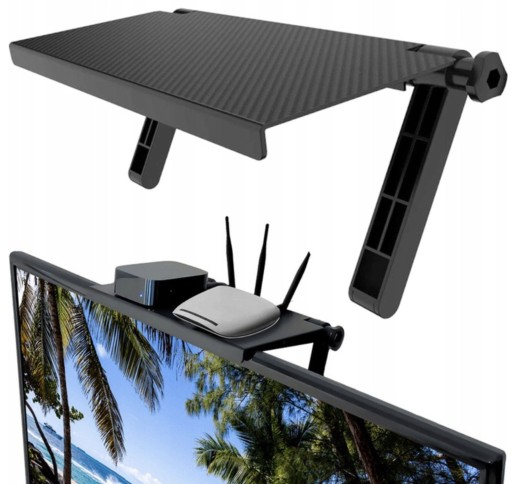 Wygodna, kompaktowa półka przeznaczona do montażu na górnej części ramki telewizora lub monitora LCD. Pozwala w sprytny sposób zaoszczędzić miejsce na biurku i stole. Bardzo prosty i nieinwazyjny montaż zapobiega uszkodzeniu sprzętu. Regulowany uchwyt umożliwia zmianę kąta nachylenia półki i dopasowanie jej do tylnej części ekranu. Doskonały gadżet który umożliwia wygodne przechowywanie pilota od telewizora czy innych drobnych przedmiotów.