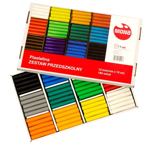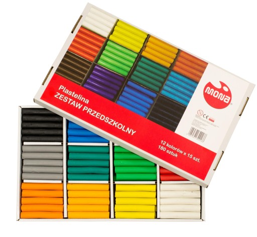 Plastelina MONA, zestaw dla przedszkoli, 180 sztukZestaw plastelin w ekonomicznym opakowaniu idealnie sprawdzi się na zajęciach plastycznych w placówkach oświatowych Zawiera 180 laseczek plasteliny w 12 kolorach.Cechy produktu: wysokiej jakości masa plastyczna wykonana na bazie wosku miękka i elastyczna nie klei się do rąk barwy żywe i nasycone nie wysycha na powietrzu idealna do szkoły, domowych i przedszkolnych zabaw oraz do zajęć terapeutycznych konsystencja pozwalająca na łączenie podstawowych kolorów dla uzyskania szerokiej palety barw 12 kolorów x 15 szt. waga laseczki plasteliny: 15 g