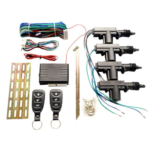 - Zestaw zamka centralnego składający się z centralki sterującej, 1 siłownika 5-przewodowego, 3 siłowników 2-przewodowych, dwóch pilotów zdalnego sterowania, przewodów połączeniowych, osprzętu instalacyjnego oraz schematu podłączenia