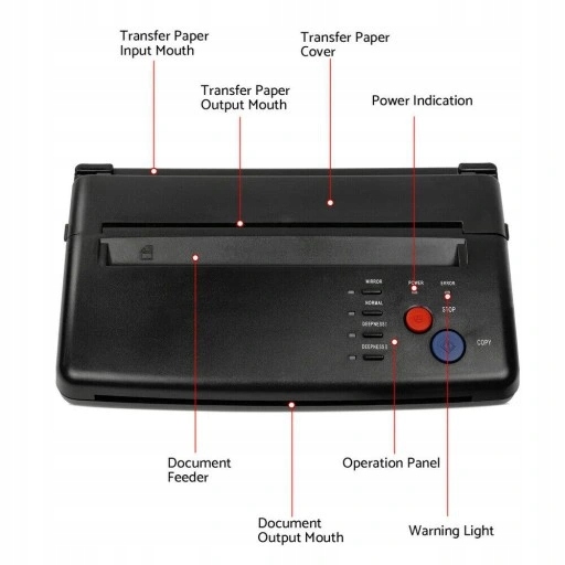 W 100% nowa i wysokiej jakości maszyna do transferu tatuażu jest przeznaczona do zwykłego papieru do tatuażu i kopii zdjęć, zapewniając szybkie i efektywne drukowanie transferowe, szczególnie dla papieru dokumentowego lub zdjęcia o skomplikowanych wzorach. To naprawdę dobry pomocnik dla artysty tatuażu.