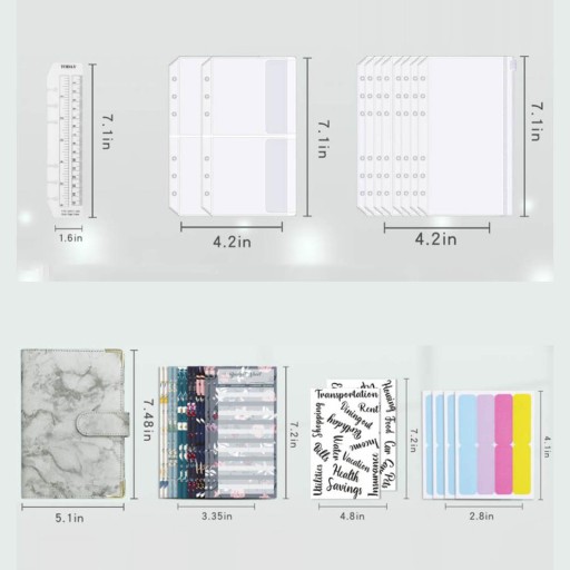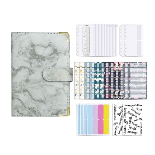 Zestaw pakietów: Pakiet notatnika A6 ze skóry PU zawiera 1* segregator A6, 12* arkusz budżetowy segregatora, 2* naklejki, 4* etykiety, 1* miękką linijkę, 1* kieszonkę na drobne, 8* torbę na zamek błyskawiczny.