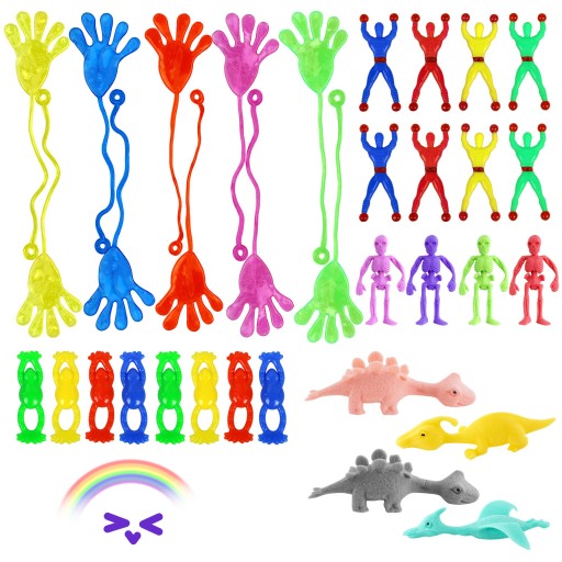 PAKIET ZAWIERA: 8 pełzaczy, 8 latających żab, 10 lepkich rąk, 4 rozciągliwe jaszczurki i 4 rozciągliwe dinozaury. Otrzymujesz niesamowitą różnorodność 34 lepkich zabawek.